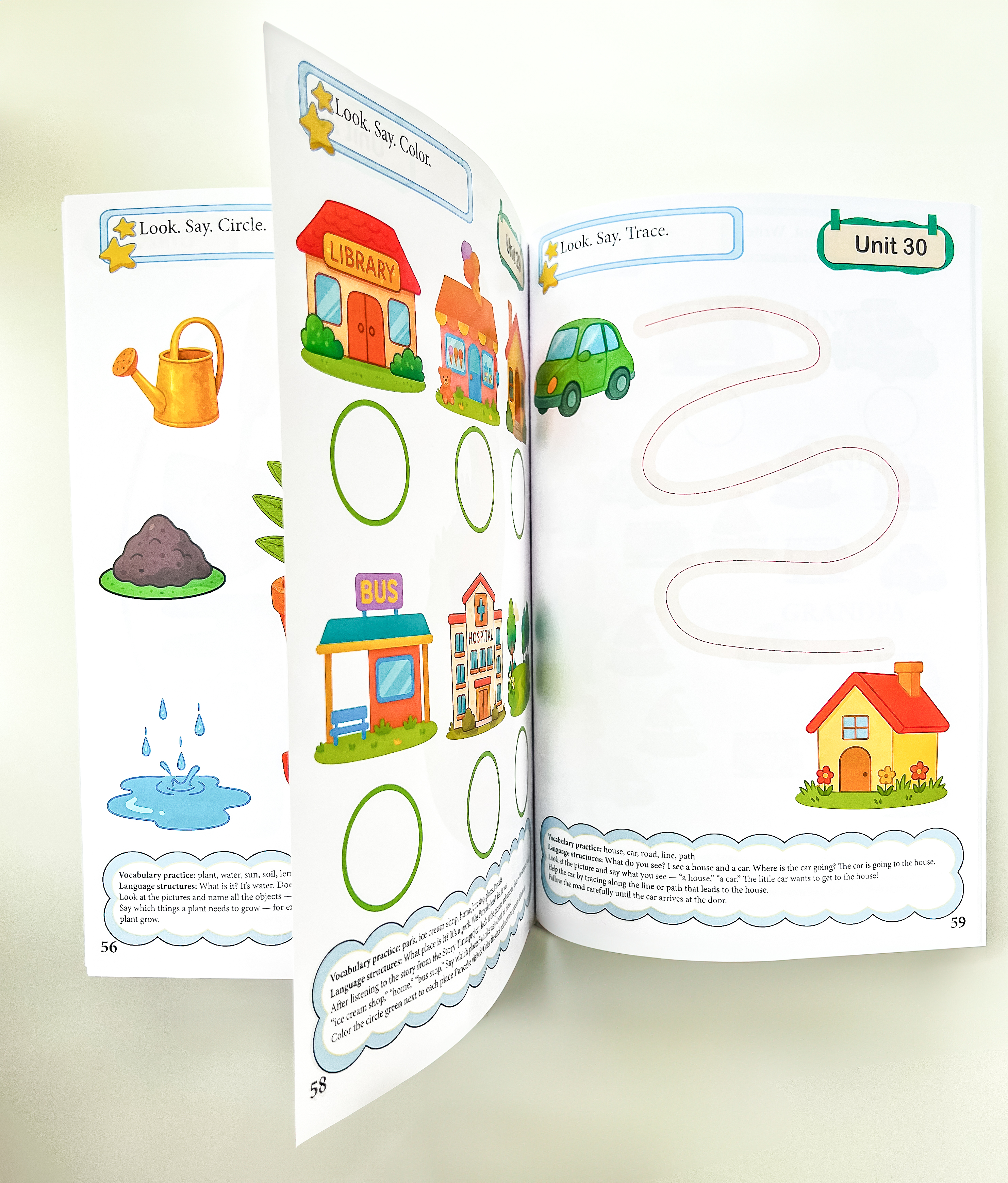 Każda strona zawiera opis zadania, wskazówki dla dorosłego oraz propozycje utrwalenia słownictwa.